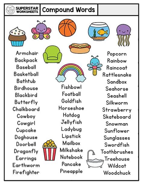 Web Some Of The Examples Of Compound Words For Kids Are Sea + Shell = Seashell, Cup + Cake = Cupcake, Cat + Fish = Catfish, Rail + Road = Railroad, Sail + Boat = Sailboat, Light + House.