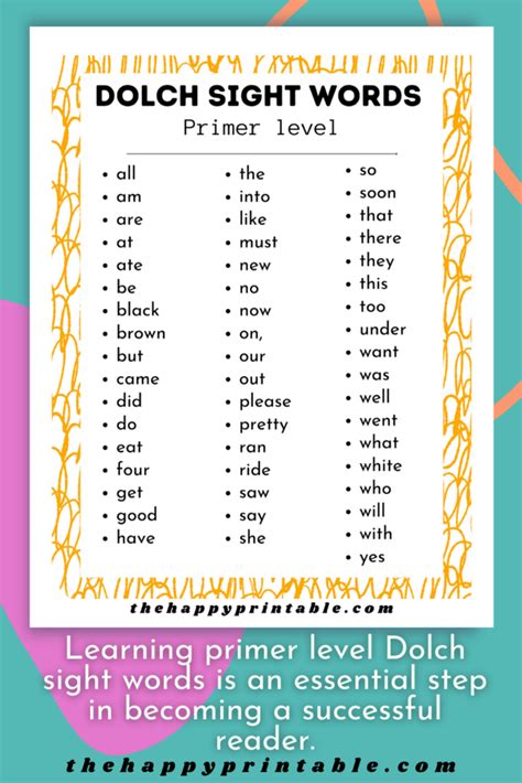 Dolch Primer Words. These are words that primary school student learn by sight alone. All am are at ate be black brown but came did do eat four get good have he into like must.
